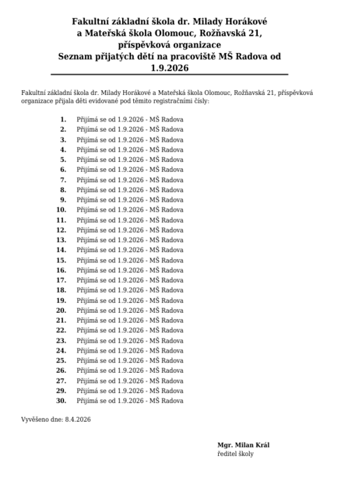 Úvod > MŠ Radova > Aktuality MŠ Radova > Výsledky zápisu do MŠ