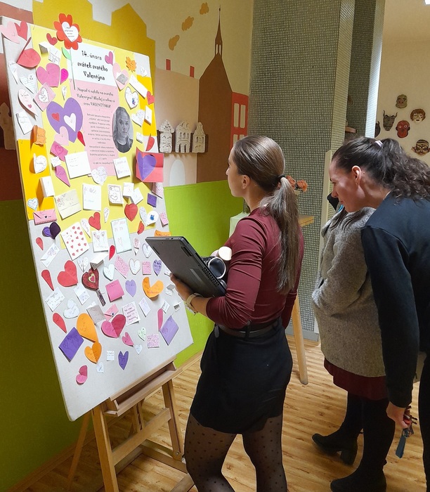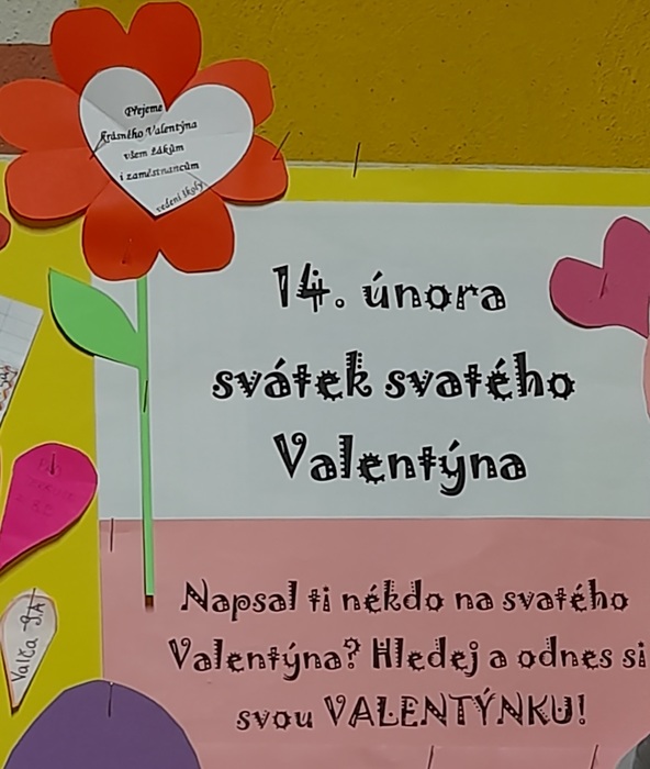 Napiš a vhoď do krabice svou Valentýnku s milým textem pro někoho, koho chceš potěšit a udělat mu radost na Svatého Valentýna. Touto instrukcí (na popud školního parlamentu) jsme se hojně řídili a vyrobili spoustu Valentýnek, které pak byly vystaveny v pátek 13. 2. (čili o den dříve) a zde si je adresáti mohli rozebrat a těšit se z nich i doma.
