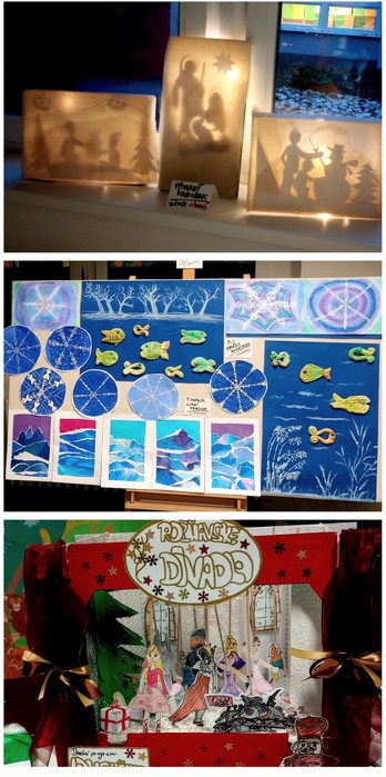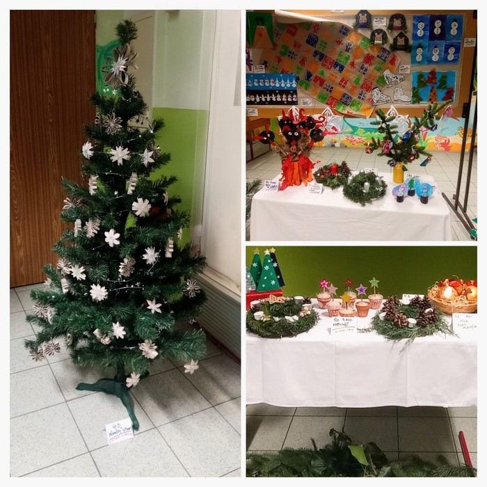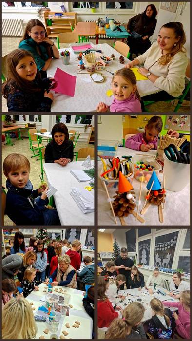 Odpoledne pokračoval den vánočními dílničkami - vyráběli jsme šiškové lyžaře, přáníčka, zdobili perníčky… Pro každé dítko byl za odměnu připraven dětský punč. Vánoční atmosféru dokreslovalo vystoupení školní kapely a pěveckého sboru. Pro návštěvníky byla také připravena vánoční výstava, na které se žáci napříč ročníky mohli pochlubit svými zdařilými výtvory.