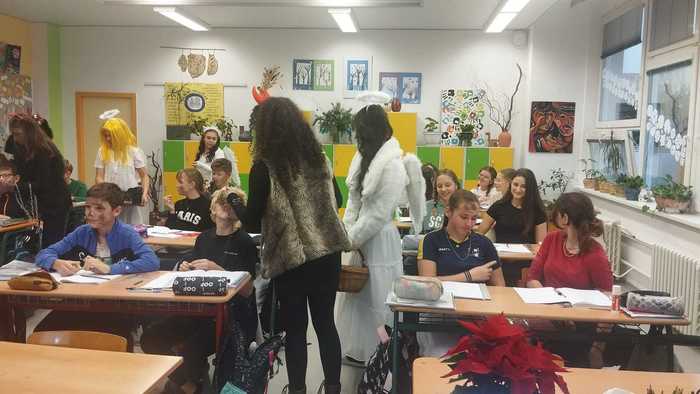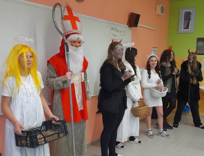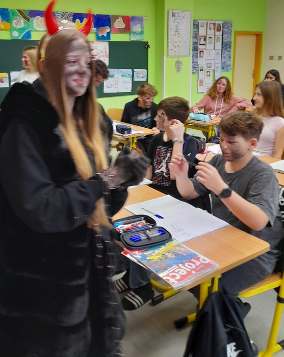 Děkujeme zejména žákům devátých tříd, kteří se rádi převlékli do kostýmů a obešli všech 30 tříd! Někde slyšeli básničku, jinde jim zazpívali.